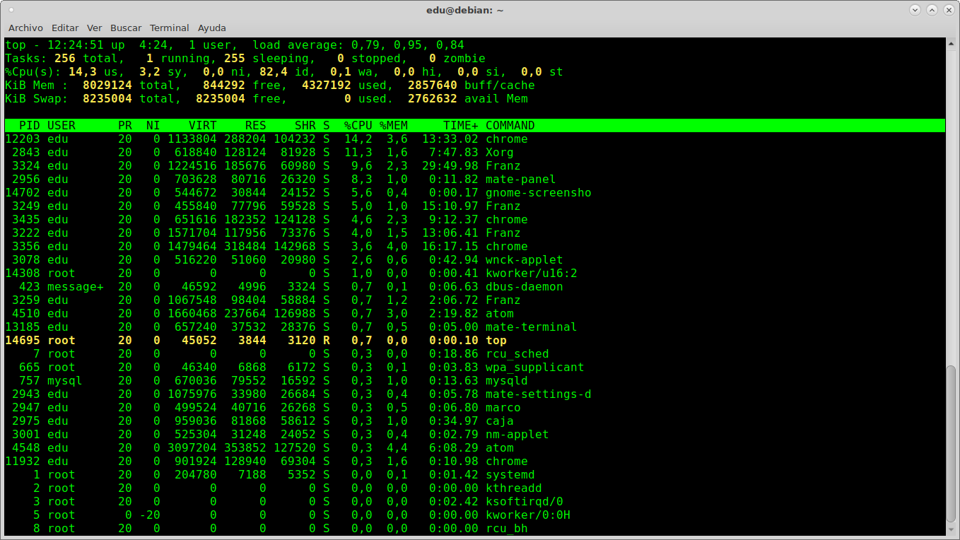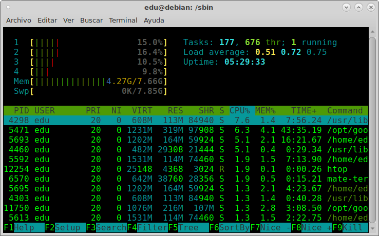 Con htop podremos obtener un resultado más amigable, no esta instalado por defecto se ha de instalar mediante $ apt-get install htop ... una vez instalado ...